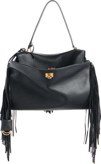 The epitome of understated luxury with a Western flair, this top-handle bag crafted of supple calfskin leather features a slouchy silhouette with a two-position flap closure and a swingy curtain of fringe.