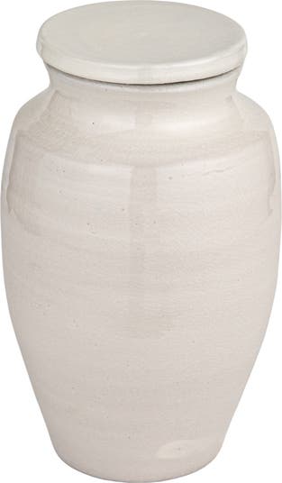 This large round white terracotta cachepot with a lid is a stunning piece to enhance home décor. The cachepot has a round shape and a white color contrasting with the plants or flowers it holds. The cachepot has a textured surface that gives it character and a curved rim that adds style. The cachepot has a matching lid that fits snugly on top, creating a sleek and seamless look. The lid can also be removed to reveal the contents of the cachepot or to allow more air and light for the plants or flowers. The cachepot and lid are made of durable terracotta, a natural and durable material with a rustic and earthy look. They are easy to clean and maintain with a dry cloth. The item measures 7.25 inches round x 12 inches high. This large round white terracotta cachepot with a lid is a perfect way to add a touch of elegance and simplicity to any home décor.