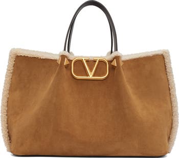 Medium VLOGO Genuine Shearling Trim Suede Tote