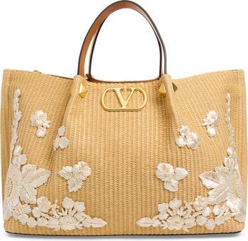 High-polish VLOGO hardware creates a house-signature focal point on this woven raffia tote embroidered with 3D flowers and leaves.