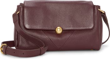 Brushed logo hardware highlights the richly textured leather on a slouchy bag featuring a divided interior and adjustable crossbody strap for versatile wear.