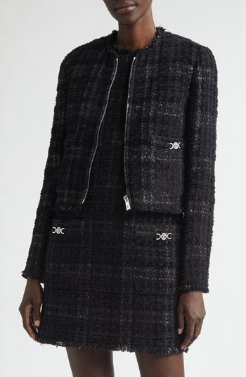 Borrowed from the maison's '90s archives, gleaming Medusa-head hardware channels Versace opulence on this fete-ready jacket fashioned from fringed metallic tweed.