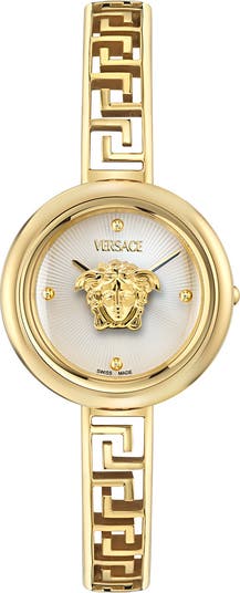 An elegantly simplified watch features classic Versace iconography cleverly integrated via the Greek key–cutout bracelet and the 3D Medusa head floating at the center of the dial.