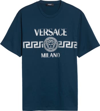 Channel quintessential Versace glamour in this glitter-dazzled cotton T-shirt decorated with Greek-key detailing and a signature Medusa-head mascot—a nod to the molded door of the maison's first headquarters.