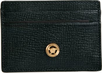 Gleaming Medusa-head hardware adds a brand-signature touch to a compact card case crafted from richly grained leather.