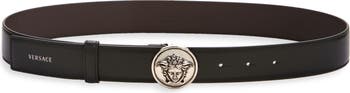 A round, gleaming buckle centered with a signature Medusa insignia distinguishes a supple calfskin belt crafted to perfection in Italy.