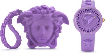 A 3D Medusa head centers the dial of a 'populent' watch designed with a case and strap made from matte silicone and featuring Swiss quartz movement.