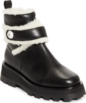 Fluffy genuine shearling trim and lining brings cozy comfort to this moto-inspired leather bootie featuring a wraparound strap and a chunky lug sole. A logoed pearly stud brings signature JC flair to the look.