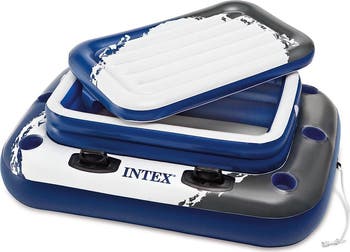 No need to get out of the pool for a nice refreshing beverage when you have an Intex Mega Chill 2. Designed with three air chambers for added safety, six built-in cup holders, four durable handles, and a removable ice chest that holds up to 72 soda cans plus ice, the Mega Chill 2 is a convenient accessory for a refreshing pool experience. The base can also be used as a floating base for a cooler up to 48 quarts. Approximate deflated size: 48" x 38" Includes: Removable ice chest. Three air chambers. Six built-in cup holders. Four durable handles. Repair patch.
