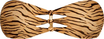 This strapless bikini top gets racy flair from a bold tiger print and knotted cutout details down the front.