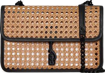 An artfully woven rattan construction framed by black leather defines this basket-inspired shoulder bag that offers versatile carrying options via top handles and a crossbody strap.