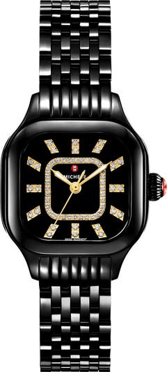 The square case's rounded corners reference cushion-cut jewels on this diamond Meggie watch further distinguished by allover matte-black ionic plating with gleaming golden hands, markers and settings.