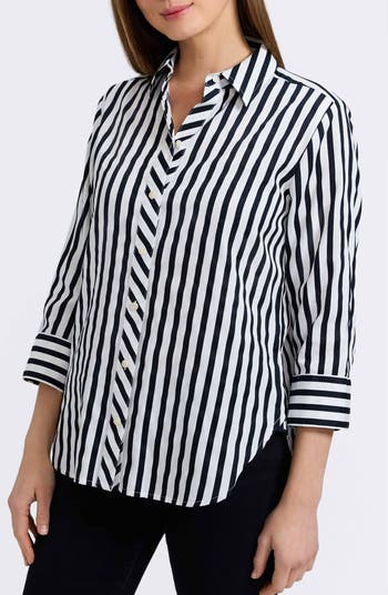 Refresh your everyday look in this all-cotton shirt framed by three-quarter sleeves and covered in black stripes except when you pop the collar and cuffs.