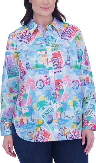 Foxcroft Meghan Travel Print Cotton Button-Up Shirt, Alternate, color, Blue Multi