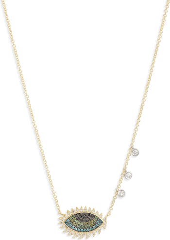 This striking pendant adds a playful perk with three bezel-set diamonds stationed along the way to the captivating eye at the finish.