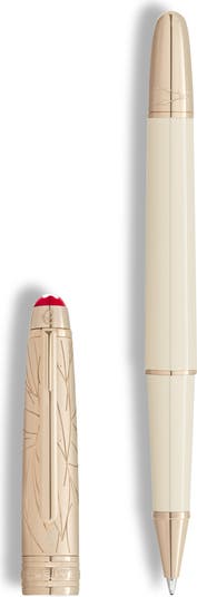 Inspired by William Shakespeare's 'Romeo and Juliet,' this rollerball pen features ivory-hued resin and engraved detailing that honors the star-crossed lovers. Feathered angel’s wings on the cap reference Juliet and her lover’s famous plea, 'O, speak again, bright angel!'