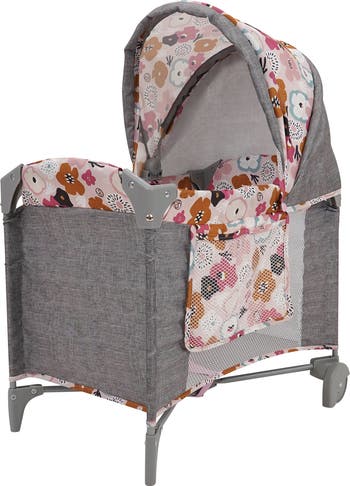- VIBRANT MELANGE FLORA DESIGN: Features a bright and playful pattern that adds excitement to doll play. Heathered grey, flowers, cream, pink & orange coloring. The play yard is suitable for dolls up to 18".