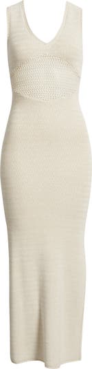 A body-skimming crocheted midi dress with a skin-baring front panel, this striking style is designed with a deep V-neckline and sporty racerback for a modern edge. A side slit adds movement and amps up the allure.