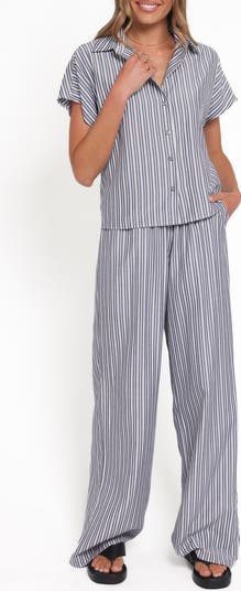 Stroll through sunlit days in this airy striped set that pairs a short-sleeve button-up top with matching wide-leg pants.