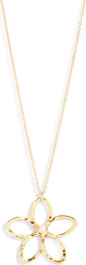 A freshwater pearl illuminates the flower-shaped pendant that shines with a plating of 14-karat gold on this handcrafted necklace from the Hawaii-based brand.