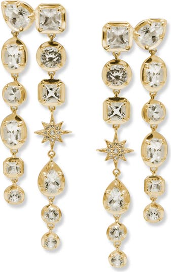 Staggered streams of star-framed diamonds and mixed shape clear topaz dangle from two piercings in these light-reflecting drop earrings.