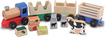 A colorful wooden farm train hauls a cow, milk jugs, crates of fruits and veggies, plus big imaginations.