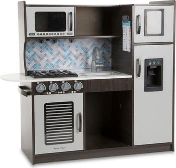 - Includes oven, stovetop with turning dials, microwave with turntable, refrigerator, ice maker, freezer, sink, grocery checklist, movable hooks and shelves