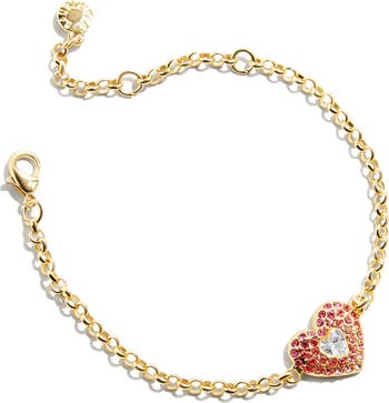 A pavé sparkling heart forms a stunning focal point for this statement-making bracelet fashioned with gleaming chains.
