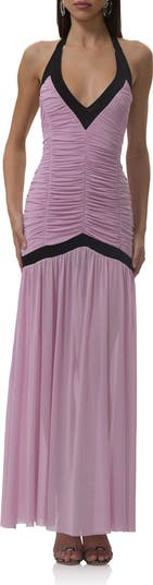 Shirred seaming lends drapey dimension to this drop-waist maxi dress featuring a deeply dipped halter neck, a pop of contrast trim and a slightly sheer skirt.