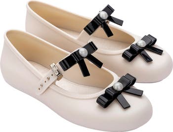 Glossy faux pearls center charming bows on a glossy mary jane flat rendered in water-resistant PVC and infused with the brand's signature fruit scent.