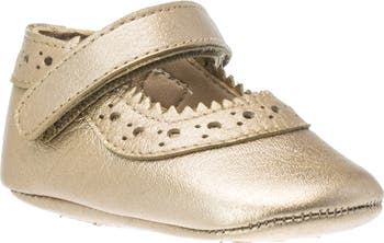 Geometric perforations and a scalloped trim bring adorable charm to a metallic leather mary jane set on a cushioned footbed and lined in breathable leather.