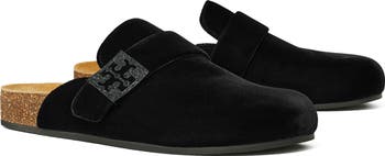 Cutaway logo hardware shimmering with crystal embellishments graces the strap of this cozy mule resting on a contoured cork footbed for easy grab-and-go comfort.