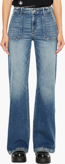 Melody High Rise flare Jeans are the perfect flare style for this chilly weather. Featuring a 10.75" leg opening in a medium wash, complemented by light whiskering around the front pockets that accentuates the jean making it seem like contrasting colors. This design includes Porkchop pockets and back dart details, finished with a 1" hem and a classic single-button closure.