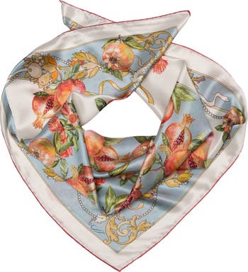 I’m delighted to share this beautiful scarf with you! Inspired by the pomegranate leaf wreaths that newlywed women in ancient Rome wore - a symbol of love, purity and abundance. Pomegranates have been cherished in Italy for centuries, and I even have three pomegranate trees on our little farm. This design feels truly special to me, with its delicate ribbons, pearls, and pomegranate flowers beautifully printed on the softest silk satin. It’s luxurious, timeless, and a little piece of Italy you can wear every day.