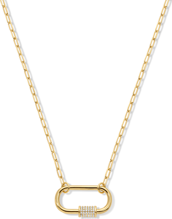 The Melrose Necklace is a paperclip chain with hardware-inspired edge and a crystal-detailed carabiner for the perfect touch to complete any outfit.