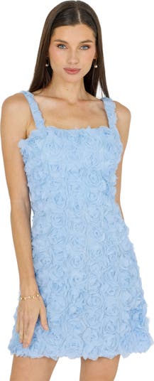 Introducing the Melvina 3D Floral Mini Dress in Blue. With a Straps Square Neck and intricate 3D floral embellishments, this dress captures the essence of romance and charm. Perfect for special events, the warm hue and fitted silhouette add sophistication and a youthful vibe. Experience the meticulous attention to detail and make a statement in this luxurious dress. Made in Turkey. Where to wear: Pretty date nights, romantic dinner parties, champagne with the girls, glam functions and events. Pairs well with: 'Andromeda' mules in white and a tonal clutch. Underwear solution: We suggest a balconette bra if required. Main - 3D Rose Applique: 100%polyester. Model wears size xs.