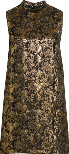 An ode to bygone glamour, this metallic floral jacquard minidress shimmers with every step, pairing a high neckline with a romantic bow at the back. Fully lined for a smooth fit, it balances vintage nostalgia with a modern shift silhouette.