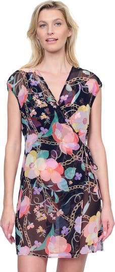 Step into elegance with the Gottex Memories of Capri Floral Chain Short Surplice Wrap Dress. Designed to make a statement, this cover-up features a stunning floral chain print in a striking multi-color palette, perfect for adding a touch of sophistication to your beach or resort attire.