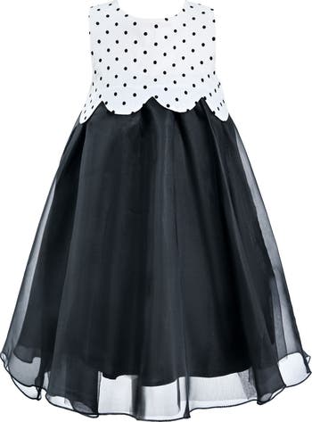 The Menorca dress featuring a sleeveless cut bodice with polka dots, scalloped hem leading to a long lightweight skirt. The perfect dress for any special occasion!