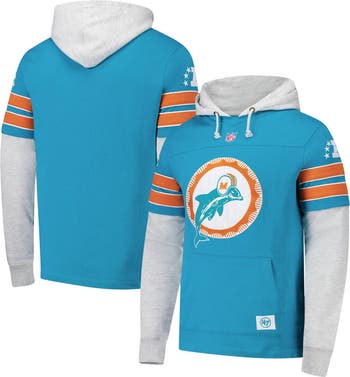Embrace chilly game days in old-school style with this Miami Dolphins Throwback Double Header Blitz Cornerback Pullover Hoodie from '47. It boasts a large retro team logo on the front and sewn-on stripes in coordinating team colors. Soft fleece lining and rib-knit trim provide an extra layer of warmth and comfort as you cheer on the Miami Dolphins.