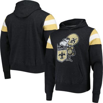 This New Orleans Saints Premier Nico pullover hoodie from '47 features distressed graphics that make an epic, vintage style choice on game day. This midweight hoodie features fleece lining and a front pouch pocket that provides extra warmth when the temperature drops. Finished off with contrasting colors at the shoulder, this New Orleans Saints pullover is sure to be a favorite in any collection.