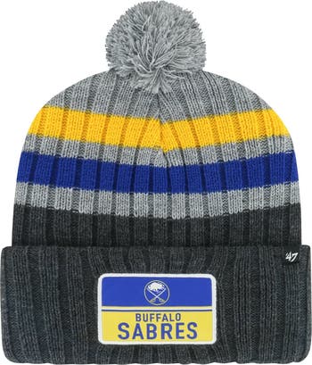 To show team spirit while keeping warm, sport this cuffed '47 Stack hat. A knit design supplies the ideal coverage, stretch and warmth for the ultimate fit. A striking Buffalo Sabres applique, coordinating stripes and a top pom combine for a charming accessory.