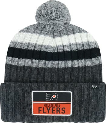 To show team spirit while keeping warm, sport this cuffed '47 Stack hat. A knit design supplies the ideal coverage, stretch and warmth for the ultimate fit. A striking Philadelphia Flyers applique, coordinating stripes and a top pom combine for a charming accessory.