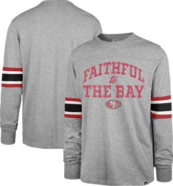 The Men's '47 Gray San Francisco 49ers Faithful to The Bay Cover Two Brex Long Sleeve T-shirt is a testament to your unwavering loyalty to the San Francisco 49ers. Its distressed screen print graphics and sewn-on stripes evoke the team's rich history, while the comfortable cotton-polyester blend ensures you stay cozy and stylish on game day. Whether you're cheering from the stands or simply showing your support, this long sleeve t-shirt is the perfect way to represent the San Francisco 49ers and the NFL.