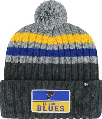 To show team spirit while keeping warm, sport this cuffed '47 Stack hat. A knit design supplies the ideal coverage, stretch and warmth for the ultimate fit. A striking St. Louis Blues applique, coordinating stripes and a top pom combine for a charming accessory.