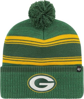 Warm up your noggin with a bold showing of Green Bay Packers pride by adding this Fadeout Cuffed Knit Hat with Pom from '47 to your collection. The team-colored details and classic construction give you a spirited yet versatile look, while the embroidered graphics offer an added boost of flair. The toasty knit design makes this hat a strong choice when the temperature dips on Green Bay Packers game day.