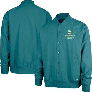 Rep your team with this San Diego Padres Anderson Twill Full-Snap Bomber Jacket from '47. Constructed with a microblend twill fabric for a midweight feel, this jacket is perfect for layering during those crisp game days or cool evenings out on the town. The rib-knit cuffs and hem ensure a fit that stays put, while the small embroidered team logo at the left chest with established date and script adds a subtle touch of team pride.