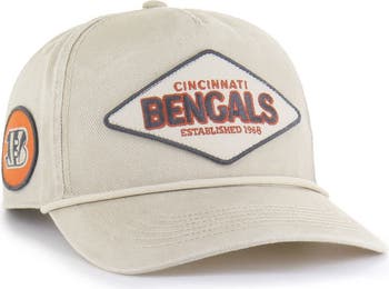 Show your allegiance to the Cincinnati Bengals in vintage-inspired style with this Cairn Adjustable Hat from '47. The Hitch line of caps feature a retro silhouette with a pinched five-panel crown and a distinctive braided rope cord. Constructed from garment-washed cotton, this hat offers a comfortable, worn-in fit and feel that's perfect for game day or everyday wear. The embroidered, throwback graphics on the front and right side with the established year add classic team spirit to a hat worthy of kickoff.