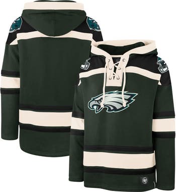 Stay warm while representing your Philadelphia Eagles in style with this '47 Superior Lacer Pullover Hoodie. This stylish hoodie features fabric applique graphics embroidered on the chest and shoulders for a unique look that will make you stand out from the crowd. The lace-up neckline with metal grommets adds a touch of rugged style and the fleece lining provides an extra layer of warmth.