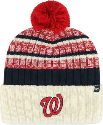To show Washington Nationals spirit while keeping warm, sport this cuffed '47 Tavern hat on chilly game days. A knit design supplies the ideal coverage, stretch, and warmth for the ultimate fit. Fresh Washington Nationals graphics, coordinating colors, and a pom top combine for a charming accessory.